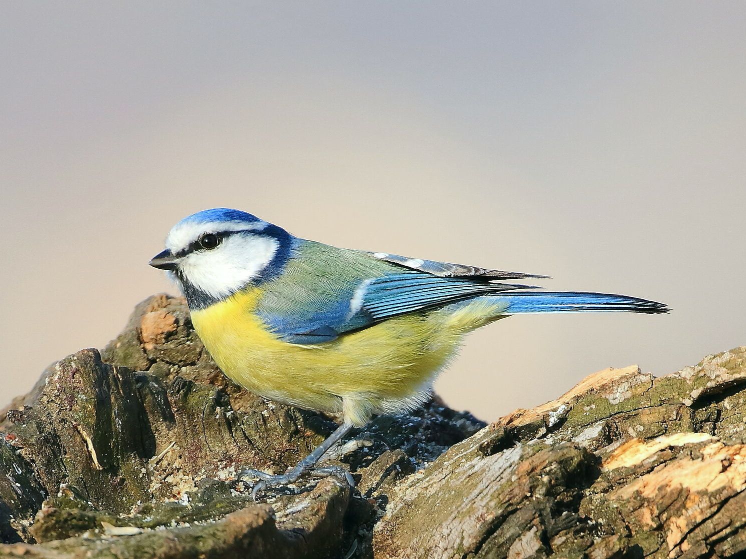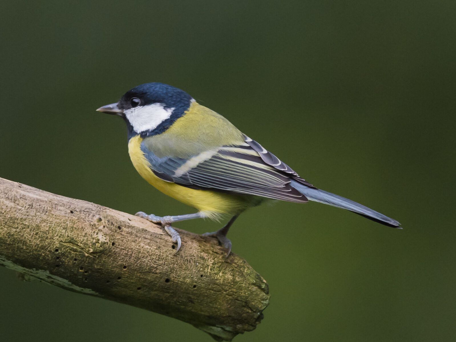 Как выглядит. Большая синица оправдывает первую часть своего названия: она раза в полтора крупнее других синиц, но вот синего цвета в ее окраске практически нет. У нее черная голова с крупными белыми щеками, зеленоватая спина и лимонно-желтая грудь, посередине которой проведена черная полоса. У самца этот «галстук» на брюшке расширяется, а у самки, наоборот, сужается.