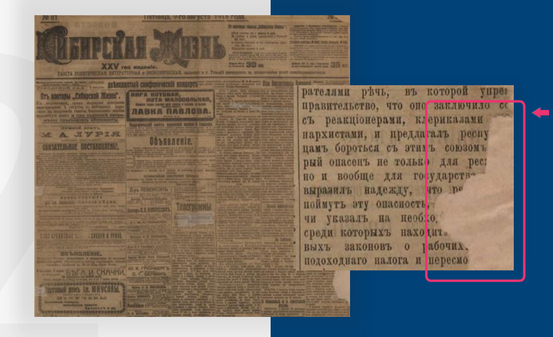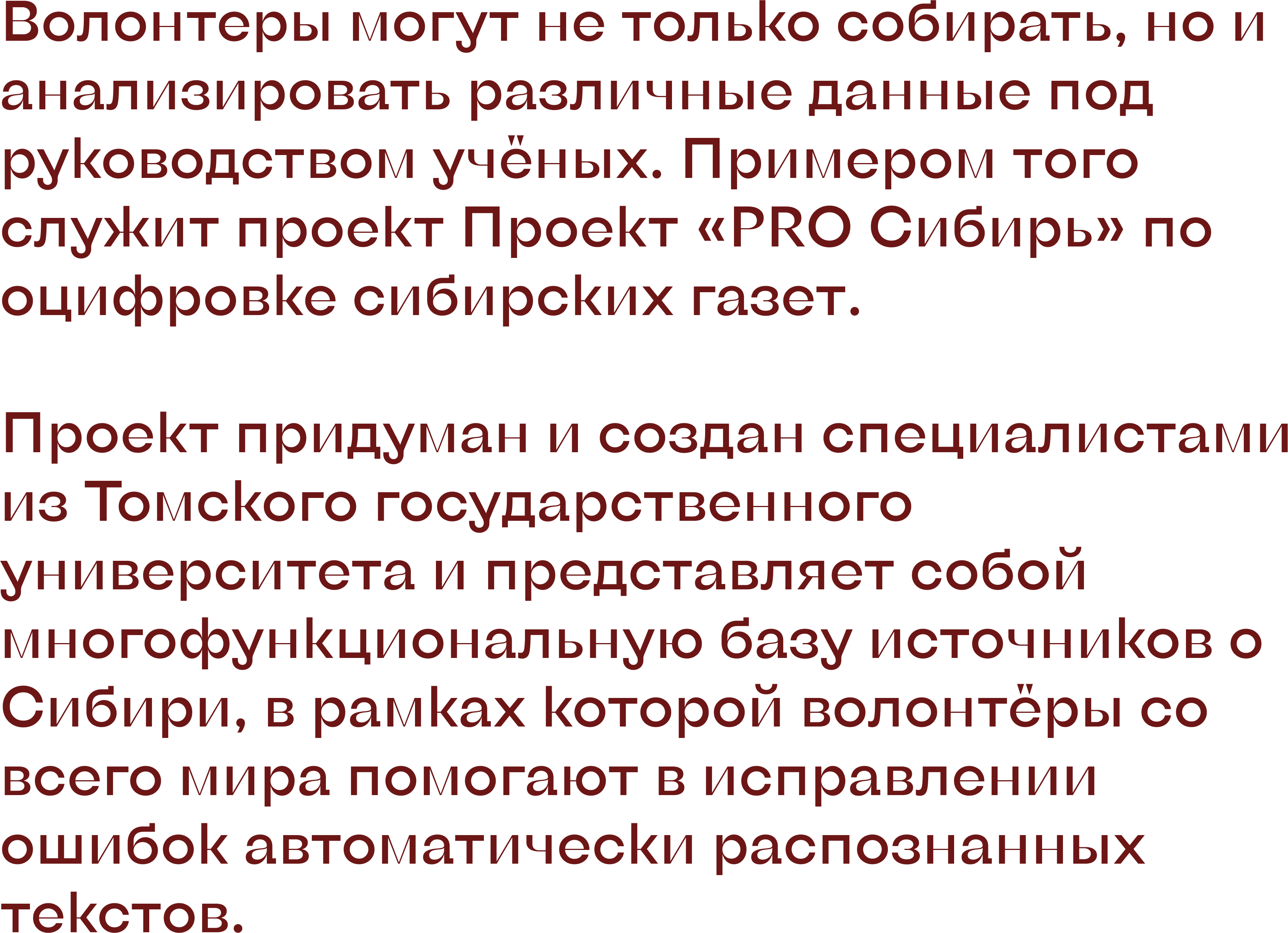 У нас есть отсканированная газета и для того, чтобы текст был читабельным и слова из этого текста можно было искать в поиске, в том числе через Гугл, эти тексты нужно редактировать. Для автоматическое распознавания есть программы, но, к сожалению, они не всегда делает это качественно, поэтому волонтеры должны эти тексты редактировать.