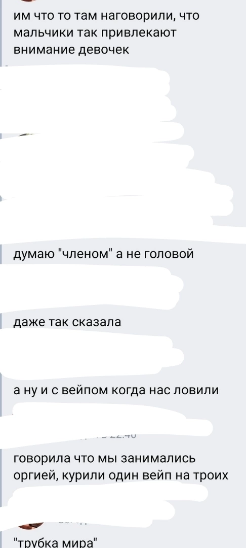 У нас как-то мальчиков спалили, что они курили вейп в туалете, и психологиня сказала, что они занимались оргией.